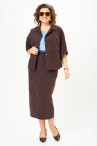 Костюм 2-хпредметный. Жакет приталенного силуэта, обработан подкладкой. Отрезной по линии талии, декорирован пришитым поясом по линии талии. Низ изделия обработан баской, собранной в складку. Рукав длинный, вачной. Окат рукава обработан вставкой для удлиннения плечевого шва. Перед жакета обработан сборкой. Брюки прямого кроя, длинна 7/8, застёжка- гульфик , по боковым швам обработаны карманы