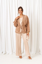 Этот 3-х предметный комплект состоит из жакета, корсетного топа и брюк. Жакет в благородном цвете эспрессо создан для элегантного и женственного образа. Классический воротник повторяет V-образную форму, делает акцент и визуально удлиняет шею, а приталенный крой подчёркивает линии силуэта. Декоративные золотистые пуговицы делают образ более рокошным и праздничным. Карманы с клапанами. Корсетный топ с открытыми плечами — воплощение чувственной элегантности. Открытые плечи подчеркивают линию шеи и ключиц, а корсетный крой создает безупречный силуэт. Роскошный силуэт и акцентная баска делают его идеальным выбором для особенного вечера. Также топ отлично вписывается в повседневные образы. Брюки станут глотком свежего воздуха среди широких силуэтов и брюк палаццо. Их облегающий крой подчёркивает линию бедёр и тали, а затем изящно расклешается от колена.Такой фасон позволит скорректировать фигуру и подойдёт для строго дресс кода. Вертикальные линии по центру брючин вытягивают силуэт и удлиняют ноги. Застёжка классическая - молния и пуговица в цвет изделия.