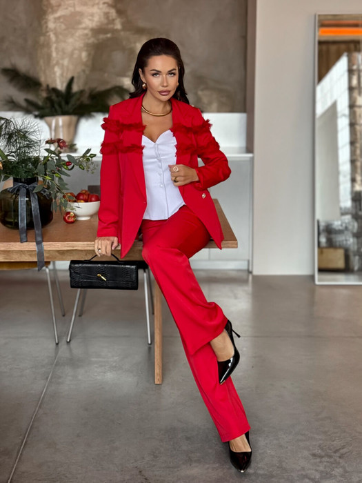 Этот 2-х предметный комплект состоит из корсетного топа и брюк. Корсетный топ с открытыми плечами — воплощение чувственной элегантности. Открытые плечи подчеркивают линию шеи и ключиц, а корсетный крой создает безупречный силуэт. Роскошный силуэт и акцентная баска делают его идеальным выбором для особенного вечера. Также топ отлично вписывается в повседневные образы. Брюки станут глотком свежего воздуха среди широких силуэтов и брюк палаццо. Их облегающий крой подчёркивает линию бедёр и тали, а затем изящно расклешается от колена.Такой фасон позволит скорректировать фигуру и подойдёт для строго дресс кода. Вертикальные линии по центру брючин вытягивают силуэт и удлиняют ноги. Застёжка классическая - молния и пуговица в цвет изделия.