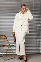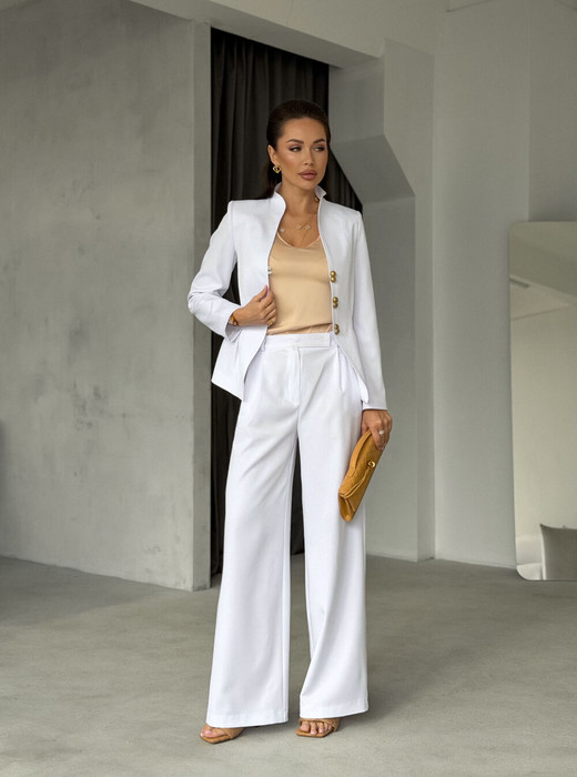 Этот 2-х предметный комплект состоит из жакета и брюк. Жакет. Нежный утонченный жакет выполнен из плотной костюмной ткани, обработан подкладкой. Приталенный крой мягко облегает фигуру, а изящные подплечники добавляют образу уверенности и грации, напоминая о классических образах французского кинематографа. Складки, создающие рельеф баски, мягко ложатся на бедра за счет своей геометрии. Рукава прямые втачные, одношовные. Брюки. Широкие брюки в классическом белом цвете сочетают в себе элегантность и удобство и станут эффектной деталью базового гардероба. Свободный крой не сковыает движений, а завышенная талия подчеркнут фигуру. Складки добавляют образу элегантность. Застёжка на потайные кнопки без лишнего визуального шума.