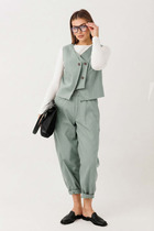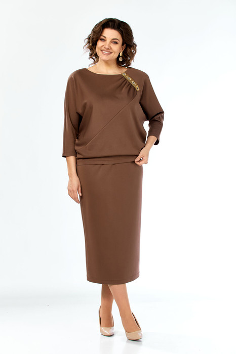 Комплект женский, состоящий из джемпера и юбки. Джемпер покроя "летучая мышь" с 3/4 рукавом, вырез горловины "лодочка", по переду ассиметричные подрезы и драпировка, от горловины-вставка из тесьмы пайеток и камней, как декоративный элемент. Юбка прямая на поясе с эластичной тесьмой.