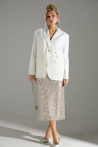 Комплект женский, состоящий из жакета и брюк. Жакет прилегающего силуэта с вертикальными рельефами от проймы по переду и спинке, с отложным воротником, с застёжкой спереди на петли и пуговицы, рукав вточной 2-х шовный со шлицей, по переду карманы с клапаном. Изделие на подкладке. Брюки прямые, зауженные к низу, на поясе-кокетке с застёжкой спереди на молнию и пуговицу, с боковыми карманами, со стрелками и шлёвками.