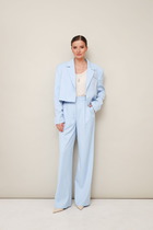 Комплект женский юбочный, состоит из жилета и юбки. Жилет укороченный, двубортный с отложным воротником с лацканами, по переду и спинке вертикальный рельефы, по переду обманки-клапаны, изделие на подкладке. Юбка прямая, зауженная к низу, на поясе, застёжка сзади на молнию и пуговицу, с боковыми карманами, сзади шлица, изделие на подкладке.
