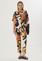 Комплект женский состоящий из жакета и брюк. Жакет прилегающего силуэта с застёжкой спереди на пуговицы, с отложным воротником с лацканами, с фигурным подрезом по переду и спинке и вставкой из сетки, с карманами по переду, с втачным рукавом. Изделие на подкладке. Брюки узкие, на поясе-кокетке, с застёжкой спереди на молнию и пуговицы, с боковыми карманами и стрелками.
