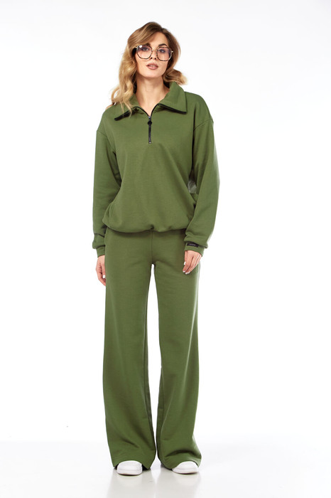 Комплект женский брючный спортивный,состоящий из  джемпера и брюк. Джемпер свободгого покроя со спущенной проймой и рукавом на манжете, с застёжкой спереди на молнию, с воротником, с карманами по переду изделия. На манжете по низу изделия. Брюки прямые, расширенные к низу, на поясе  с эластичной тесьмой, с карманами в боковых швах.