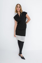 Платье прямого силуэта , "оверсайз", с цельнокроеным рукавом длиной 3/4, заканчивающимся притачной отложной манжетой, выполнено из двух видов ткани. Перед с втачными планками по горловине и центральной застёжкой  на 2 кнопки, и декоративным элементом из сетки. Воротник - стойка. Спинка с отрезной кокеткой из сетки и средним швом. В боковых швах разрезы.