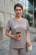 Костюм женский из трикотажного полотна «кулирка» с набивным рисунком, состоящий Футболка – из полотна с набивным рисунком, свободного покроя, с короткими втачными рукавами, горловиной овальной формы, окантованной основным материалом. На полочке выполнена вышивка.Шорты - из полотна с набивным рисунком, свободные, с карманами в боковых швах, на притачном поясе с эластичной тесьмой внутри. Детали передних половин разрезаны по косой, в шве соединения кант контрастного цвета.