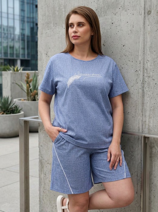 Костюм женский из трикотажного полотна «кулирка» с набивным рисунком, состоящий Футболка – из полотна с набивным рисунком, свободного покроя, с короткими втачными рукавами, горловиной овальной формы, окантованной основным материалом. На полочке выполнена вышивка.Шорты - из полотна с набивным рисунком, свободные, с карманами в боковых швах, на притачном поясе с эластичной тесьмой внутри. Детали передних половин разрезаны по косой, в шве соединения кант контрастного цвета.