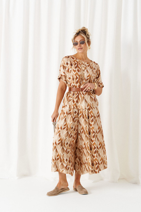 Женский легкий костюм из вискозной ткани, любимые и удобные юбка-брюки, свободная и непринужденная блуза. Созданный в расслабленном крое с подчеркнутыми деталями, костюм позволит чувствовать себя комфортно и уверенно.