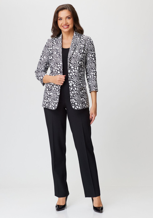 Комплект женский-двойка, жакет удлиненный, из хлопковой ткани, полуприлегающего силуэта с центральной бортовой застежкой на пуговицы до линии перегиба лацкана. Спереди рельефные швы от плечевого шва, отрезной бочок и карман с клапаном. Спинка с рельефами от плечевого шва. Рукав втачной, двухшовный, 3/4, с небольшим разрезом в локтевом шве. Воротник пиджачного типа. Перед жакета на подкладке. Длина по спинке 67 см, длина рукава 50 см. Брюки прямые,классические, из текстильной ткани, с заутюженными стрелками,по переду обработаны карманы с отрезным бочком,застежка на тесьму-молнию и 1 пуговицу.На задних половинках обработаны вытачки и имитация карманов с листочкой, пояс в брюках притачной.  Длина брюк от талии по боковому шву 105 см.