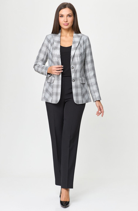 Комплект женский-двойка, из текстильной ткани, жакет удлиненный, полуприлегающего силуэта с центральной бортовой застежкой на пуговицы до линии перегиба лацкана. Спереди рельефные швы от плечевого шва, отрезной бочок и карман с клапаном. Спинка с рельефами от плечевого шва. Рукав втачной, двухшовный. Воротник пиджачного типа. Жакет на подкладке, длина по спинке 67 см, длина рукава 62 см. Брюки прямые,классические, с заутюженными стрелками,по переду обработаны карманы с отрезным бочком,застежка на тесьму-молнию и 1 пуговицу.На задних половинках обработаны вытачки и имитация карманов с листочкой, пояс в брюках притачной. Длина брюк от талии по боковому шву 100 см.