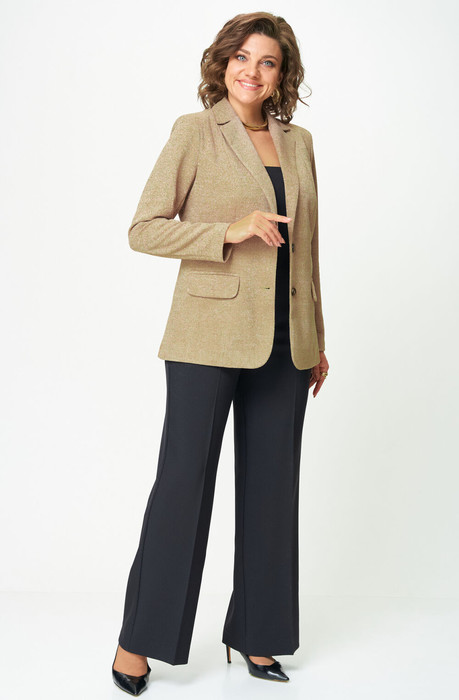Комплект женский-двойка, из текстильной ткани, жакет женский удлиненный, из трикотажной ткани, перед жакета на подкладке, полуприлегающего силуэта с центральной бортовой застежкой на пуговицы до линии перегиба лацкана. Спереди рельефные швы от плечевого шва, отрезной бочок и карман с клапаном. Спинка с рельефами от плечевого шва. Рукав втачной, двухшовный. Воротник пиджачного типа. Длина по спинке 70, длина рукава 61. Брюки-палаццо,средней ширины,из плотной текстильной ткани, выполнены с карманами с отрезным бочком в боковом шве. Пояс притачной, застёжка на молнию. По задним половинкам обработаны вытачки. Длина по боковому шву 108 см.