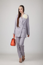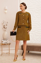 Комплект женский, 2-х предметный, состоит из жакета и и брюк. Жакет женский удлиненный, из текстильной ткани, на подкладке, полуприлегающего силуэта с центральной бортовой застежкой на пуговицы до линии перегиба лацкана. Спереди рельефные швы от плечевого шва, отрезной бочок и карман с клапаном. Спинка с рельефами от плечевого шва. Рукав втачной, двухшовный, по низу рукава обработана шлица на петли-пуговицы. Воротник пиджачного типа. Длина по спинке 66 см, длина рукава 62 см.Брюки прямые,классические, с заутюженными стрелками,по переду обработаны карманы с отрезным бочком,застежка на тесьму-молнию и 1 пуговицу.На задних половинках обработаны вытачки и имитация карманов с листочкой, пояс в брюках притачной. Длина брюк от талии по боковому шву 100 см.