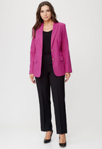 Комплект женский, 2-х предметный, состоит из жакета и и брюк. Жакет женский удлиненный, из текстильной ткани, на подкладке, полуприлегающего силуэта с центральной бортовой застежкой на пуговицы до линии перегиба лацкана. Спереди рельефные швы от плечевого шва, отрезной бочок и карман с клапаном. Спинка с рельефами от плечевого шва. Рукав втачной, двухшовный, по низу рукава обработана шлица на петли-пуговицы. Воротник пиджачного типа. Длина по спинке 66 см, длина рукава 62 см.Брюки прямые,классические, с заутюженными стрелками,по переду обработаны карманы с отрезным бочком,застежка на тесьму-молнию и 1 пуговицу.На задних половинках обработаны вытачки и имитация карманов с листочкой, пояс в брюках притачной. Длина брюк от талии по боковому шву 100 см.