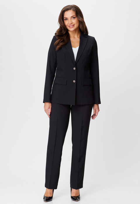 Комплект женский-двойка, из текстильной ткани, жакет удлиненный, полуприлегающего силуэта с центральной бортовой застежкой на пуговицы до линии перегиба лацкана. Спереди рельефные швы от плечевого шва, отрезной бочок и карман с клапаном. Спинка с рельефами от плечевого шва. Рукав втачной, двухшовный. Воротник пиджачного типа. Жакет на подкладке, длина по спинке 67 см, длина рукава 62 см. Брюки прямые, классические, с заутюженными стрелками, по переду обработаны карманы с отрезным бочком, застежка на тесьму-молнию и 1 пуговицу. На задних половинках обработаны вытачки и имитация карманов с листочкой, пояс в брюках притачной, по боковому на резинке. Длина брюк от талии по боковому шву 103 см.