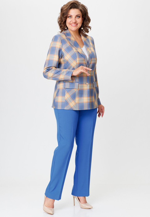 Комплект женский-двойка, из текстильной ткани, жакет удлиненный, полуприлегающего силуэта с центральной бортовой застежкой на пуговицы до линии перегиба лацкана. Спереди рельефные швы от плечевого шва, отрезной бочок и карман с клапаном. Спинка с рельефами от плечевого шва. Рукав втачной, двухшовный. Воротник пиджачного типа. Жакет на подкладке, длина по спинке 67 см, длина рукава 62 см. Брюки прямые, классические, с заутюженными стрелками, по переду обработаны карманы с отрезным бочком, застежка на тесьму-молнию и 1 пуговицу. На задних половинках обработаны вытачки и имитация карманов с листочкой, пояс в брюках притачной, по боковому на резинке. Длина брюк от талии по боковому шву 103 см.