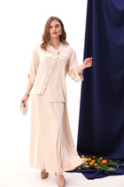 Комплект женский-двойка, из текстильной ткани, жакет удлиненный, полуприлегающего силуэта с центральной бортовой застежкой на пуговицы до линии перегиба лацкана. Спереди рельефные швы от плечевого шва, отрезной бочок и карман с клапаном. Спинка с рельефами от плечевого шва. Рукав втачной, двухшовный. Воротник пиджачного типа. Жакет на подкладке, длина по спинке 66 см, длина рукава 62 см. Брюки прямые, классические, с заутюженными стрелками, по переду обработаны карманы с отрезным бочком, застежка на тесьму-молнию и 1 пуговицу. На задних половинках обработаны вытачки и имитация карманов с листочкой, пояс в брюках притачной. Длина брюк от талии по боковому шву 103 см.