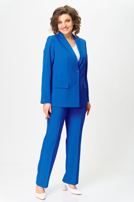 Комплект женский-двойка, из текстильной ткани, жакет удлиненный, полуприлегающего силуэта с центральной бортовой застежкой на пуговицы до линии перегиба лацкана. Спереди рельефные швы от плечевого шва, отрезной бочок и карман с клапаном. Спинка с рельефами от плечевого шва. Рукав втачной, двухшовный. Воротник пиджачного типа. Жакет на подкладке, длина по спинке 67 см, длина рукава 62 см. Брюки прямые, классические, с заутюженными стрелками, по переду обработаны карманы с отрезным бочком, застежка на тесьму-молнию и 1 пуговицу. На задних половинках обработаны вытачки и имитация карманов с листочкой, пояс в брюках притачной. Длина брюк от талии по боковому шву 103 см.