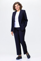 Комплект 2-х предметный из хлопковой ткани, состоит из жакета и и брюк. Жакет женский удлиненный, полуприлегающего силуэта с центральной бортовой застежкой на пуговицы до линии перегиба лацкана. Спереди рельефные швы от плечевого шва, отрезной бочок и карман с клапаном. Спинка с рельефами от плечевого шва. Рукав втачной, двухшовный, 3/4, с небольшим разрезом в локтевом шве. Воротник пиджачного типа. Перед жакета на подкладке. Длина рукава 50, длина по спинке 68 см. Брюки-палаццо, средней ширины, выполнены с карманами с отрезным бочком в боковом шве. Пояс притачной, по боковым швам резинка, застёжка на молнию. По задним половинкам обработаны вытачки. Длина по боковому шву 108 см.