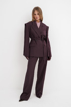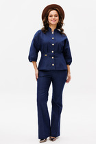 Комплект женский-двойка,из костюмной ткани, жакет удлиненный, свободного силуэта с центральной бортовой застежкой на пуговицы до линии перегиба лацкана. По переду имеется отрезной бочок и вертикальные вытачки. С прорезными карманами с клапаном и двумя обтачками. Спинка цельная. Воротник пиджачного типа. Рукав двухшовный, втачной. Жакет на подкладке. Длина рукава 63 см, длина по спинке 75 см. Брюки прямые, классические, из текстильной ткани, с заутюженными стрелками, по переду обработаны карманы с отрезным бочком, застежка на тесьму-молнию и 1 пуговицу. На задних половинках обработаны вытачки и имитация карманов с листочкой, пояс в брюках притачной. Длина брюк от талии по боковому шву 103 см.