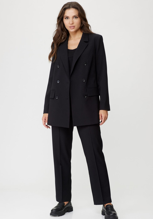 Женский комплект 2-х предметный, состоит из жакета и брюк из текстильной ткани. Жакет двубортный, свободного кроя, на подкладке. По переду имеется отрезной бочок и вертикальные вытачки. С прорезными карманами с клапаном и двумя обтачками. Спинка со средним швом. Воротник пиджачного типа. Рукав двухшовный, втачной. Длина рукава 63 см, длина по спинке 74 см. Брюки классические, прямые, заутюжены стрелки, по переду обработаны карманы с отрезным бочком, застежка на тесьму-молнию и 1 пуговицу. На задних половинках обработаны вытачки и имитация карманов с листочкой, пояс в брюках притачной, без резинки. Длина по боковому 102 см.