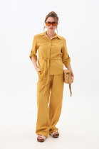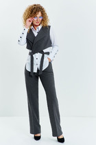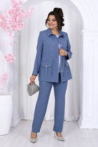 Комплект женский, 2-х предметный, состоит из жакета и и брюк. Жакет женский удлиненный, из текстильной ткани, на подкладке, полуприлегающего силуэта с центральной бортовой застежкой на пуговицы до линии перегиба лацкана. Спереди рельефные швы от плечевого шва, отрезной бочок и карман с клапаном. Спинка с рельефами от плечевого шва. Рукав втачной, двухшовный, по низу рукава обработана шлица на петли-пуговицы. Воротник пиджачного типа. Длина по спинке 66 см, длина рукава 62 см. Брюки прямые,классические, с заутюженными стрелками, по переду обработаны карманы с отрезным бочком, застежка на тесьму-молнию и 1 пуговицу. На задних половинках обработаны вытачки и имитация карманов с листочкой, пояс в брюках притачной. Длина брюк от талии по боковому шву 105 см.