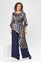 Комплект женский-двойка, блуза, свободного силуэта, из трикотажной ткани, вырез горловины V-образный,рукав немного спущенный,  фигурный, спинка цельная. Длина по спинке 59 см Брюки-палаццо,средней ширины,из плотной текстильной ткани, выполнены с карманами с отрезным бочком в боковом шве. Пояс притачной, застёжка на молнию. По задним половинкам обработаны вытачки. Длина по боковому шву 108 см.