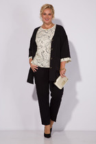 Костюм женский трех предметный. Брюки на поясе с отделочными полосками по бокам. Блузка удлиненная с закругленными разрезами по бокам. Рукав 3\4 с манжетой патай. Воротник рубашечный на стойке. Жилет с подрезами по переду и декоративной отделкой.
