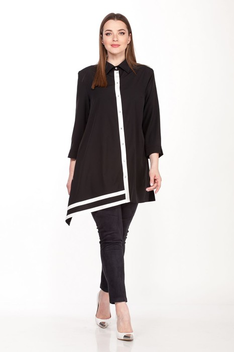 Комплект женский двухпредметный состоит из блузки и брюк. Блузка асимметричная выполнена из тонкой блузочной  ткани, свободного силуэта с одной стороны по полочке расширенная к низу, в боковых швах разрезы, воротник на стойке,планка втачная, застежка на петли и пуговицы. Рукав втачной 3/4  с притачным манжетом с разрезом. Длина изделия 80 см, рукава- 50 см. Брюки (легинсы) прилегающего силуэта,выполнены из эко-замши с добавлением эластана с декоративными подрезами, спинка  украшена нефункциональной листочкой, пояс на резинке. Длина изделия-103 см.