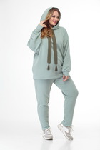 Комплект женский трехпредметный, состоит из ветровки, майки и брюк. Ветровка свободного силуэта, выполнена из хлопковой ткани без полкладки с накладными карманами на полочке и кулиской на талии. Рукав втачной с притачным манжетом на резинке по низу. Застежка молния. Длина ветровки по спинке 80 см. Майка полуприлегающего силуэта, выполнена из вискозы. По центру притачная аппликация. В боковых швах разрезы. Брюки полуприлегающнго силуэта с высокой посадкой, выполнены из хлопковой ткани. Пояс на резинке. В боковых швах карманы с листочкой.Длина брюк 100 см.