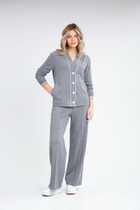 Костюм женский полуприлегающго силуэта, состоит из рубашки и брюк. Выполнен из хлопковой ткани. Рубашка с центрально-бортовой застежкой на петли и пуговицы, воротник на стойке, рукав 3/4 с притачным манжетом, в боковых швах обработаны разрезы и есть накладной карман на полочке. Брюки с высокой посадкой, пояс на резинке, в боковых швах обработаны карманы.