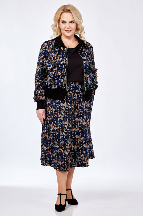 Костюм женский, двухпредметный, свободного силуэта, выполнен из трикотажной ткани. Состоит из джемпера и юбки. Джемпер с застежкой молния по центру, полочка украшена декоративными клапанпми, рукав втачной, длинный. Стойка, манжет рукава и низ джемпера выполнены из контрастной черной ткани. Длина джемпера  по спинке 50см. Юбка А- силуэта с притачным поясом на резинке, с карманами. Длина юбки 70 см.
