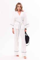 Костюм женский полуприлегающего силуэта, состоит из джемпера и брюк. Джемпер с подрезом по центру переда, с декоративным украшением, рукав втачной 3/4 с резинкой по низу, в боковых швах разрезы. Брюки с застежкой на молнию и пуговицу, в боковых швах карманы.