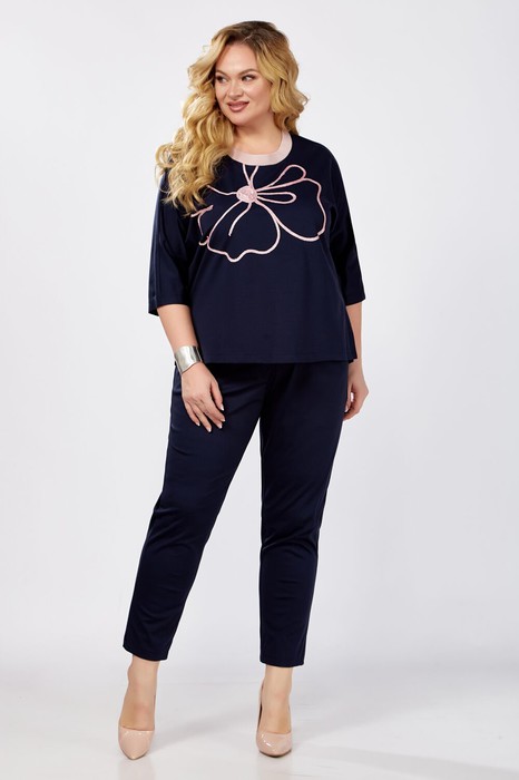 Костюм женский, полуприлегающего силуэта. Джемпер с апплекацией по переду. Рукав втачной с отрезной манжетой. Горловина обработанна трикотажным довязом. Брюки на резинке по поясу, c карманоми в боковых швах.
