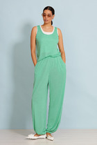 Универсальный летний костюм, состоящий из широких брюк на резинке и жилета с цветком. Изготовлен из легкой ткани, состоящей из 70% льна и 30% из хлопка.