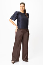 Брюки свободного силуэта, прямые к низу, выполнены из атласной ткани, брюки без застежки, верх брюк на поясе с резинкой.