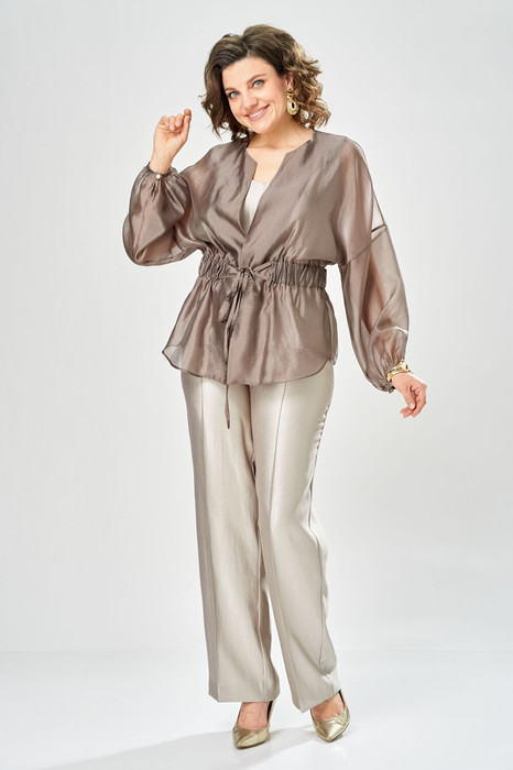 Элегантный женский комплект состоит из трёх предметов, топа, блузы и брюк. Выполнен из двух видов ткани.