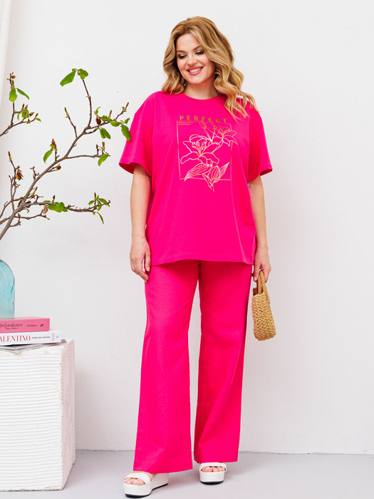 Комплект женский состоит из футболки и брюк на резинке. Базовая женская футболка. Крой футболки свободный, оверсайз. Вырез горловины круглый. Рукав до локтя. Линия плеча спущенная. Футболка выполнена из хлопкового трикотажного полотна. Трикотаж не просвечивается, не деформируется после стирки, легко гладится. По переду выполнена авторская печать в виде "Лилий" золотой фольгой. Длина - 70 см Льняные брюки свободного кроя. Пояс на резинке, для удобства в носке в пояс вставлен шнурок для регулирования обьема по талии. Посадка брюк - высокая. По переду расположены карманы с наклонным входом. По низу широкая подгибка для возможности коррекции по длине. Брюки с хорошей посадкой, в этом заключается их секрет универсальности и возможности носить их девушкам с любым типом фигуры. Идеальные брюки для летней жары, в них ваша кожа будет дышать. Они выполнены из мягкого льна с вискозой. Отличный вариант, как для городского лета, так и отдыха на море. Лен хорошо поглощает влагу, не вызывает аллергии, обладает высокой степенью воздухопроницаемости. Ткань не просвечивается, и не катается после носки. Длина изделия: 107 см Длина шагового: 82 см Ширина брюк по низу: 27 см Ширина пояса: 4 см.