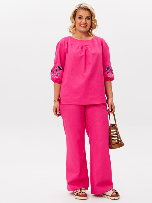 Льняной комплект из блузки и брюк.