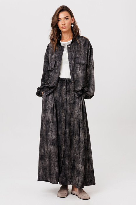 Костюм состоит из 2-х предметов бомбер и юбки. Бомбер со спущенной линией плеча и втачным рукавом внизу на притачной отстроченной манжете с вставленной в нее резинкой. Полочка с центральной застежкой по притачной планке на петли-пуговицы. По переду кокетка и имитация кармана с клапаном от кокетки. По низу изделия притачная отстроченная планка с вставленной в нее резинкой. Воротник стойка из довяза. Без подкладки. Юбка А-образного силуэта, на притачном отстроченном с вставленным в него шнурком из основной ткани. По переду с центральной застежкой на петли пуговицы. Юбка с карманами в боковых швах с наклонным входом, без подкладки.
