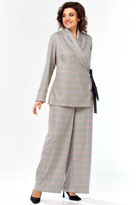 Длина жакета 72 см, рукав с учетом манжеты 62 см, манжета 12 см. Длина брюк по боковому шву с учетом пояса 106 см.