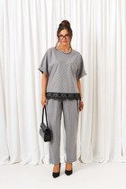 Костюм-двойка женский. Шорты с отрезным поясом и карманами. На поясе декоративный бант из атласной ленты. Свободная футболка со спущенным плечом. Декоративная контрастная отстрочка по горловине, низу изделия и среднему шву спины