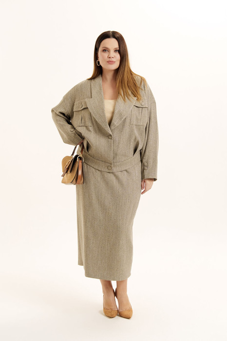 Комплект женский двухпредметный из смесовой ткани. Жакет свободного покроя. Вырез горловины - пиджачного типа фантазийной формы. Застежка - однобортная на петли с пуговицами. Рукава - втачные со спущенной линией плеча. Внизу рукавов - имитация шлиц с пуговицами. Спереди выполнены накладные карманы со складкой и клапаном. По низу изделия - отрезной пояс с мягкими складками для объема. Изделие посажено на подкладку. Юбка - зауженная к низу со шлицой на спинке. Пояс- отрезной с эластичной тесьмой и застежкой на петлю с пуговицей. в боковых швах имеются карманы с отрезными бочками. Юбка декорирована поясом в виде шнурка из основной ткани. Изделие посажено на подкладку.