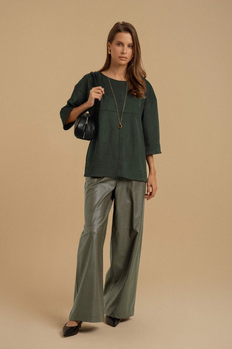 Комплект женский двухпредметный. Блузка свободного покроя из искусственной замши. Вырез горловины - неглубокий, округлой формы. Рукава - втачные со спущенной линией плеча. Изделие декорировано подрезами. Низа с широкой подгибкой и отделочными строчками. Брюки- свободного покроя из искусственной кожи на хлопковой основе. Пояс - отрезной с эластичной тесьмой. в боковых швах имеются карманы с отрезными бочками. Изделие декорировано подрезами.