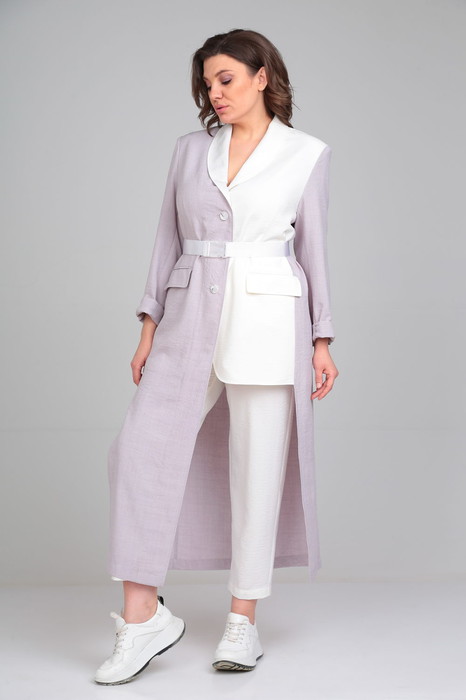 Комплект брючный (жакет+брюки). Жакет полуприлегающего силуэта с центральной застёжкой на петли и пуговицы. По спинке средний шов,бочки, по переду талиевые вытачки,обработаны прорезные карманы с обтачками и клапаном.Рукав втачной двушовный. Воротник - шалиевый. Брюки зауженные к низу, верхний срез обработан поясом с резинкой,застёжка на тесьму-молнию, петлю и пуговицу. В боковых швах обработаны карманы. В качестве отделки используется фурнитура и отделочные детали(съёмный пояс).