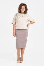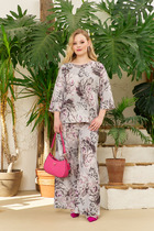 Комплект женский состоит из комбинезона и жакета. Комбинезон свободного кроя с застежкой на поясную петлю и пуговицу и на спинке, и спереди. Верхняя часть с нагрудными вытачками. Нижняя часть с боковыми карманами в швах. В области талии резинка. Жакет свободного кроя с застежкой на петлю и пуговицу. Рукав одношовный со спущенной линией плеча. Воротник пиджачного типа.Пояс в комплекте.