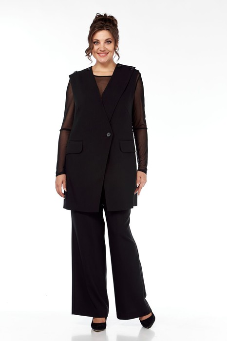 Комплект брючный состоит из жилета и брюк. Жилет с ассиметричными бортами застегивается на 1 петлю и пуговицы. Жилет полуприлегающего силуэта с отрезными бочками . Спинка сосредним швом. Перед с нагрудными вытачками и боковыми прорезными карманами в рамку с клапаном. Левая полочка с отложным лацканом, который пристегивается на 2 петли и пуговицы к плечу. Брюки прямые широкие  с застежкой на молнию спереди. Задняя половинка с талиевыми вытачками . С боковыми карманами. Пояс с резинкой и шлевками .