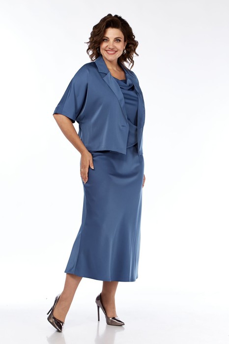 Комплект женский, состоит из платья и жакета. Жакет укроченный свободного кроя с застежкой на 1 петлю и пуговицу. Воротник пиджачного типа с лацканом. Рукав цельнокройный длиной 3/4. Платье полуприлегающего силуэта, чуть расклешенное к низу. Перед с косым подрезом и мягкими складками в области талии. Горловина в виде "качели". Пройма соспущенной линией плеча. Спинка со средним швом и потайной молнией до подреза. В области талии косой подрез.