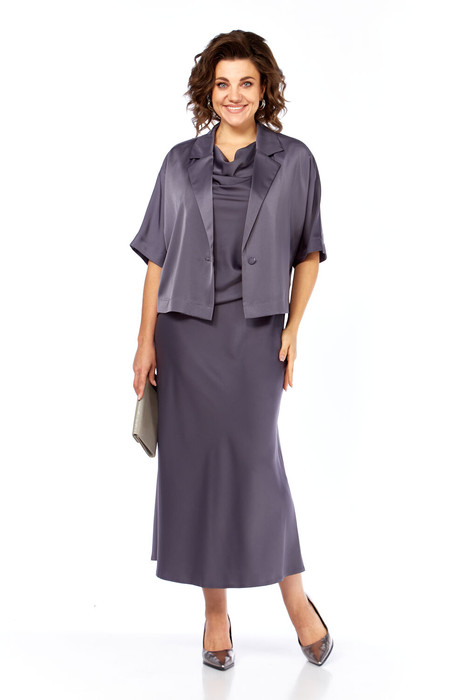 Комплект женский, состоит из платья и жакета. Жакет укроченный свободного кроя с застежкой на 1 петлю и пуговицу. Воротник пиджачного типа с лацканом. Рукав цельнокройный длиной 3/4. Платье полуприлегающего силуэта, чуть расклешенное к низу. Перед с косым подрезом и мягкими складками в области талии. Горловина в виде "качели". Пройма соспущенной линией плеча. Спинка со средним швом и потайной молнией до подреза. В области талии косой подрез.