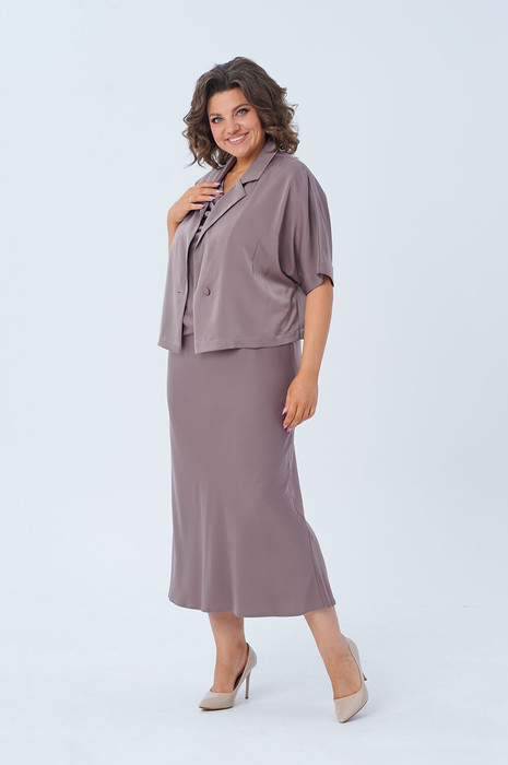 Комплект женский, состоит из платья и жакета. Жакет укроченный свободного кроя с застежкой на 1 петлю и пуговицу. Воротник пиджачного типа с лацканом. Рукав цельнокройный длиной 3/4. Платье полуприлегающего силуэта, чуть расклешенное к низу. Перед с косым подрезом и мягкими складками в области талии. Горловина в виде "качели". Пройма соспущенной линией плеча. Спинка со средним швом и потайной молнией до подреза. В области талии косой подрез.